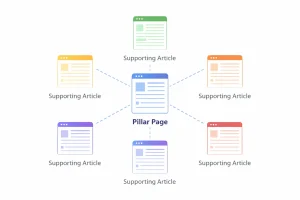| A topic cluster model showing how one pillar page and supporting articles work together to prevent keyword cannibalization and strengthen SEO authority. |